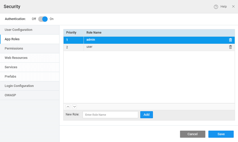 You need to add the roles that you want to use in your application as per the roles in the above-mentioned Security Providers and Roles in the App Roles tab. There are two App Roles - admin and user offered for all providers. They are for authorization and provided out of the box. Users can add/remove to suit their needs. Using the arrow keys, you can set the role precedence for multiple roles within an application. This is particularly useful when a single user has multiple roles with different overlapping functionality. For example, Manager has two roles – admin and user. And for admin the landing page is set as EmployeeDashboard, while user has the landing page as EmployeeProfile. Based on the role precedence the corresponding landing page takes priority, i.e., when Manager logs in, if admin role has higher precedence then EmployeeDashboard page is displayed, if user role has higher precedence then EmployeeProfile page is displayed.