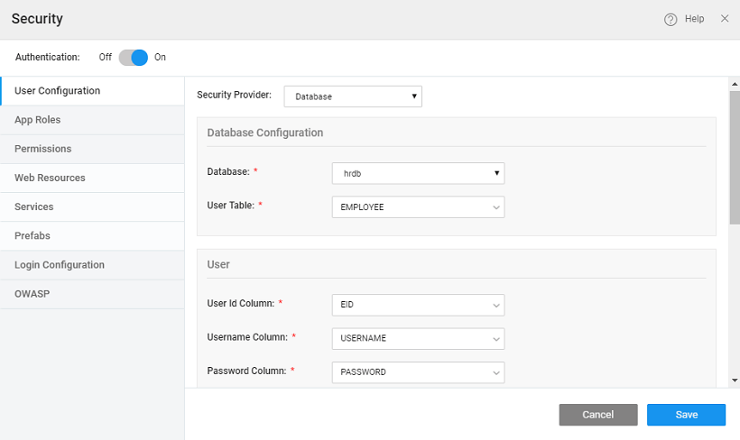 - As an example, if you select Database as Security Provider; sample hrdb as the Database; User as the Entity; Username, Userid and Password as themselves, then the sample query would be provided along with a text box to enter a sample value for username and test the query.