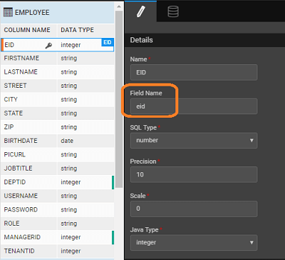 - The fieldName refers to the name of the field associated with the column in the respective table. The field name is derived from the column name in the table and usually camelCased.