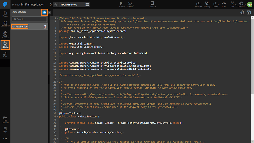 Java Services allow app developers to write custom business logic or enable integration with 3rd party libraries and tools and are deployed on the Server side. For every Java Service created in WaveMaker, its REST API contract is auto-generated and is ready for integration with front-end layer (web or mobile).