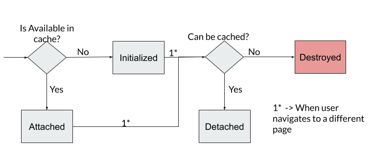 • As the user moves from Page1, Page1 instances are added to the Cache (see steps 2, 4, 6). When the user comes back to the same Page1 URL, the cached page1 instance corresponding to the URL is rendered (see steps 5, 6).