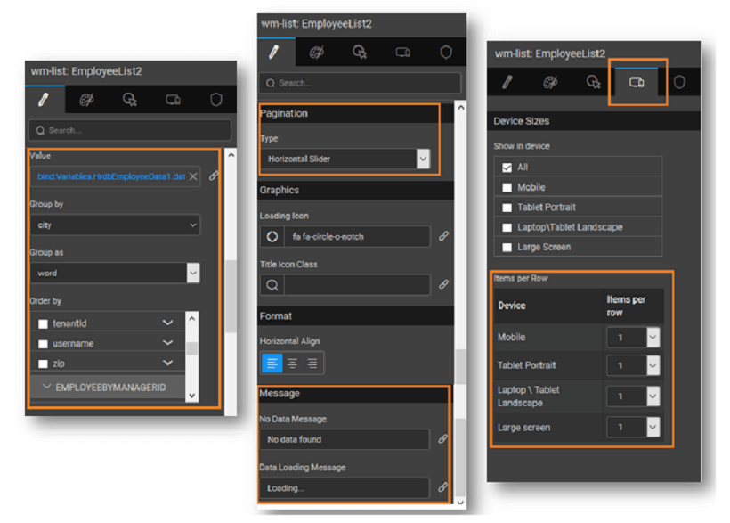 Items per row determines the number of items that can be shown in each row. This can be specified independently for different target devices from the Device tab of the Properties panel.