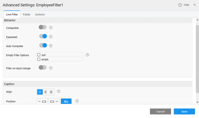 - Each of the field in the Live Filter can be selected and properties set. The Input Type property can be used to set the type of data user is required to enter. This will enforce basic validations to be performed on the values entered by the user.