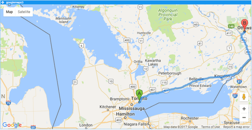 • You can plot a custom Marker on the map either by sending the Address to the markAddress function (or) by sending the lat, lng values to the markLatLng function. For example: Page.Widgets.googlemaps1.markAddress('Chicago') will plot the marker in Chicago, USA. Page.Widgets.googlemaps1.markLatLng(31.619770, 74.876713) will plot the marker according to the provided latitude, longitude values.
