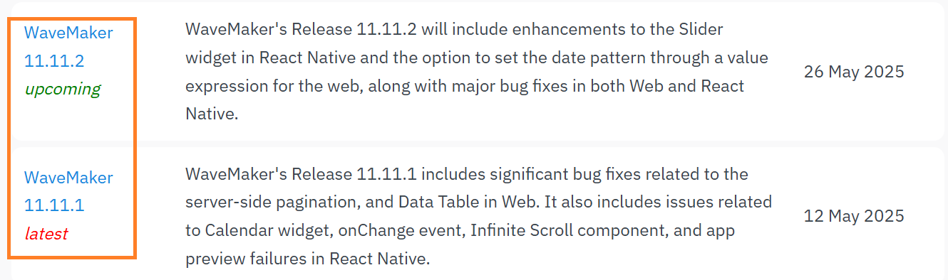 We have two types of release notes, WaveMaker Online (WMO) and WaveMaker Enterprise (WME).