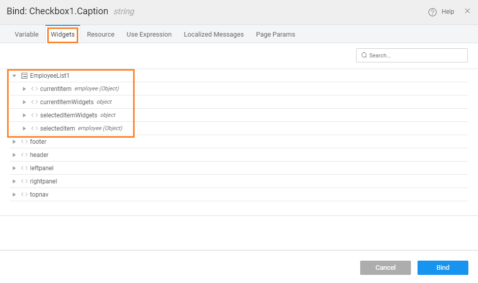 2. selecteditem & selectedItemWidgets: These bind objects can be used to capture the selected item of the list when selection is enabled for the List. The return type would be array in case of multi-select List. Both selecteditem and selectedItemWidgets can be accessed through the script as follows, the click of a button will capture the selected item firstname and the caption of widget Name: