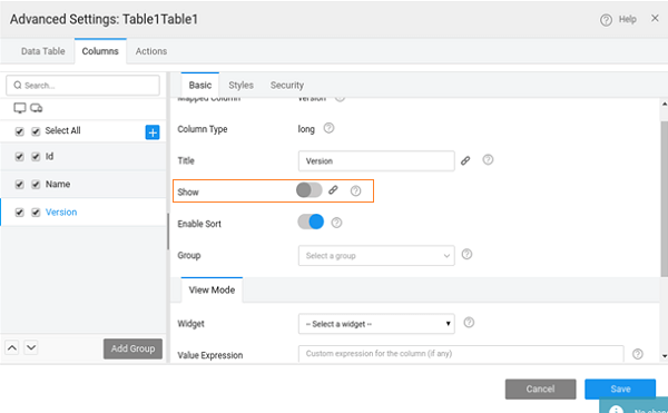 3. Open the Advanced Settings of the Data Table widget and uncheck the Show property for the version column.