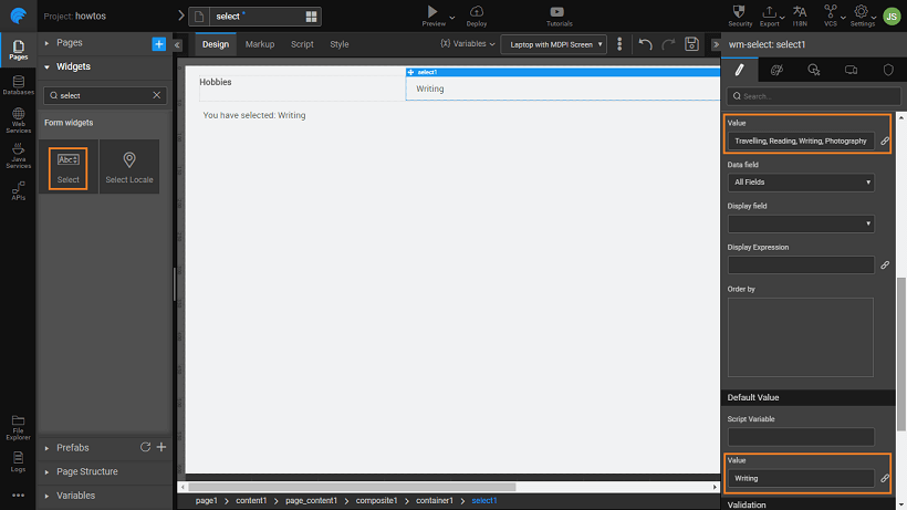 2. The simplest way to use the Select Widget is to enter the values in a comma-separated format for display in the Value property under the DATASET section. In this example, we have set the value to Travelling, Reading, Writing, Photography.