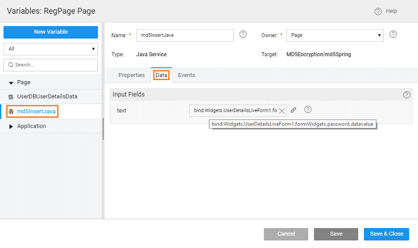 • Add the following to the Java Service code. Here we are using an MD5 hashing algorithm to generate a checksum for the password field, refer here for more details. Ensure that the length of the password column in the database is greater than the length of the result from the encryption algorithm used, in this case, it should be greater than 32.