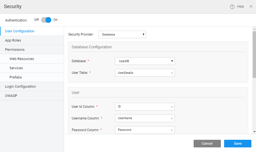 Drag and drop a Live Form widget, use the Database CRUD from the UserDB service and the UserDetails table and set the properties, as per your app requirements. We have used the following settings: