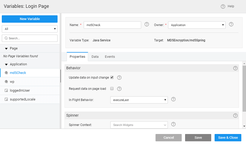• Set the onClick event of the Sign In to loginAction. This will ensure that when any user logs in, the password is encrypted before checking it against the database by the login variable.