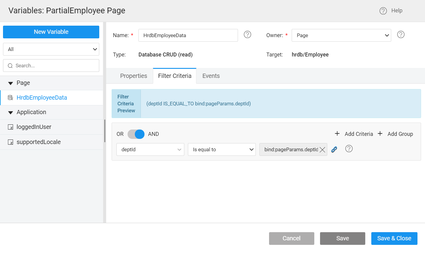 - Go to the Variable dialog. For the Employee variable under FilterCriteria, bind the deptId to the