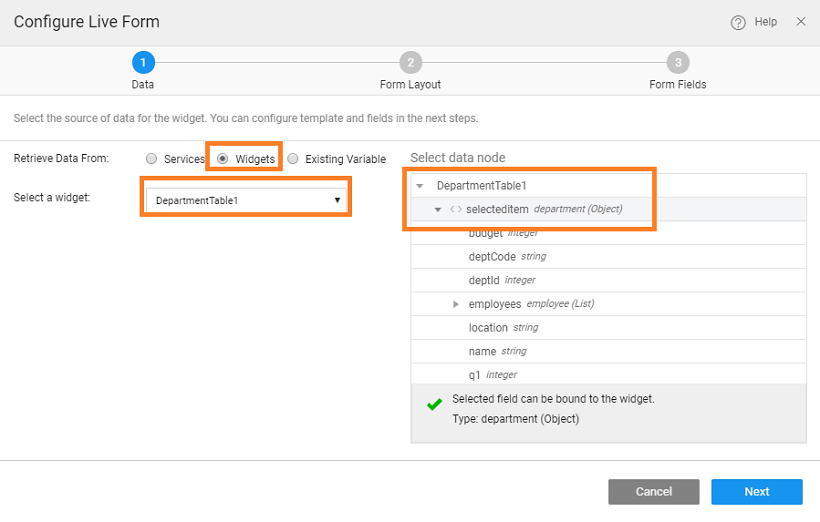 To use form for updating the table, it needs to be bound to a Data Table or a List widget's Selected row property. Here we will see linking Data Table to a Live Form, the same can be replicated for a List. Another easy way to achieve this would be to use the Editable Data Table with Live Form layout.