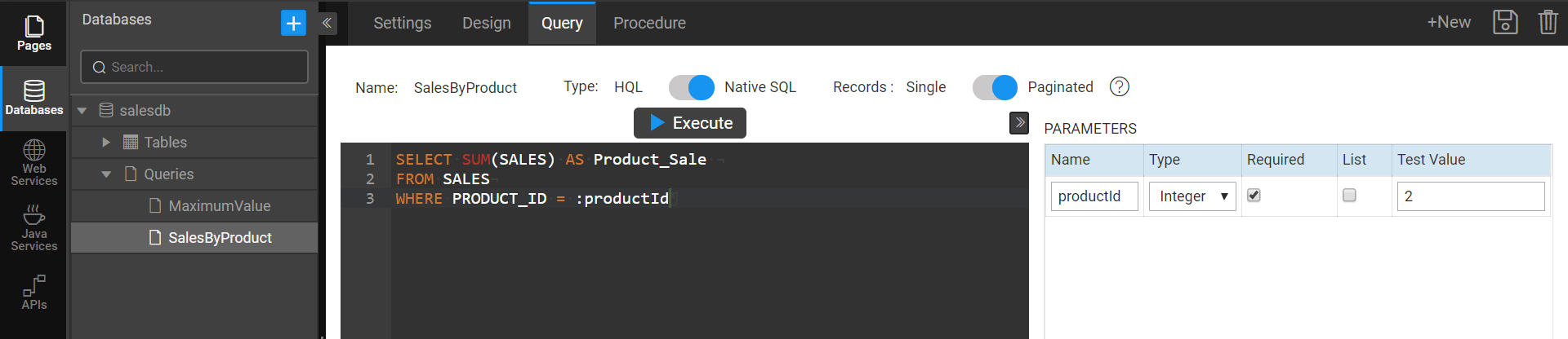 • Click +New. Create another database API to get the total of each product's sale value. For example, write the following lines of code in the query builder to get the sum of total sales for each product: