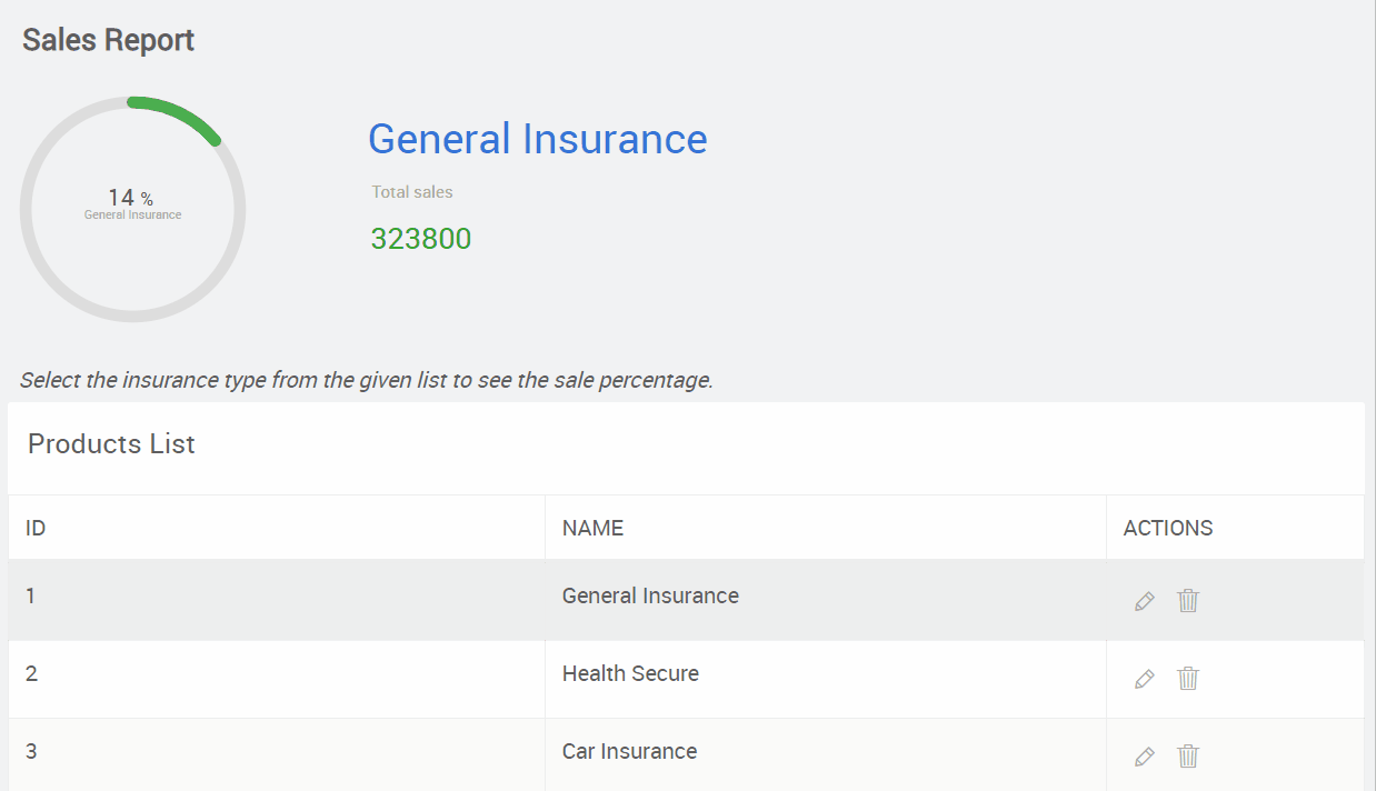 On a progress circle widget, visualize the total sales percentage of the product when you click on the item name from the data table.
