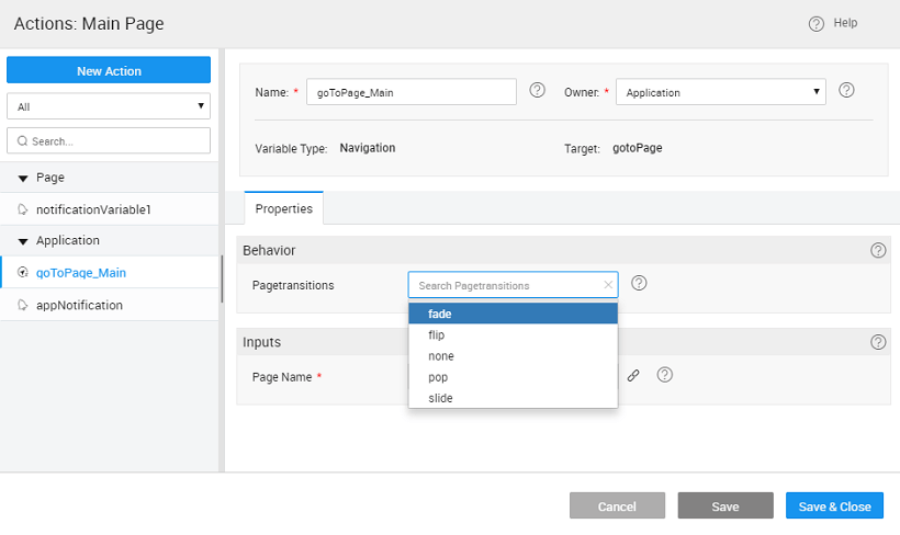 Navigation Action specifies exactly how the user should move from one page to another when an event occurs. Navigation Action is a component you can add to your project and provide the following options:
