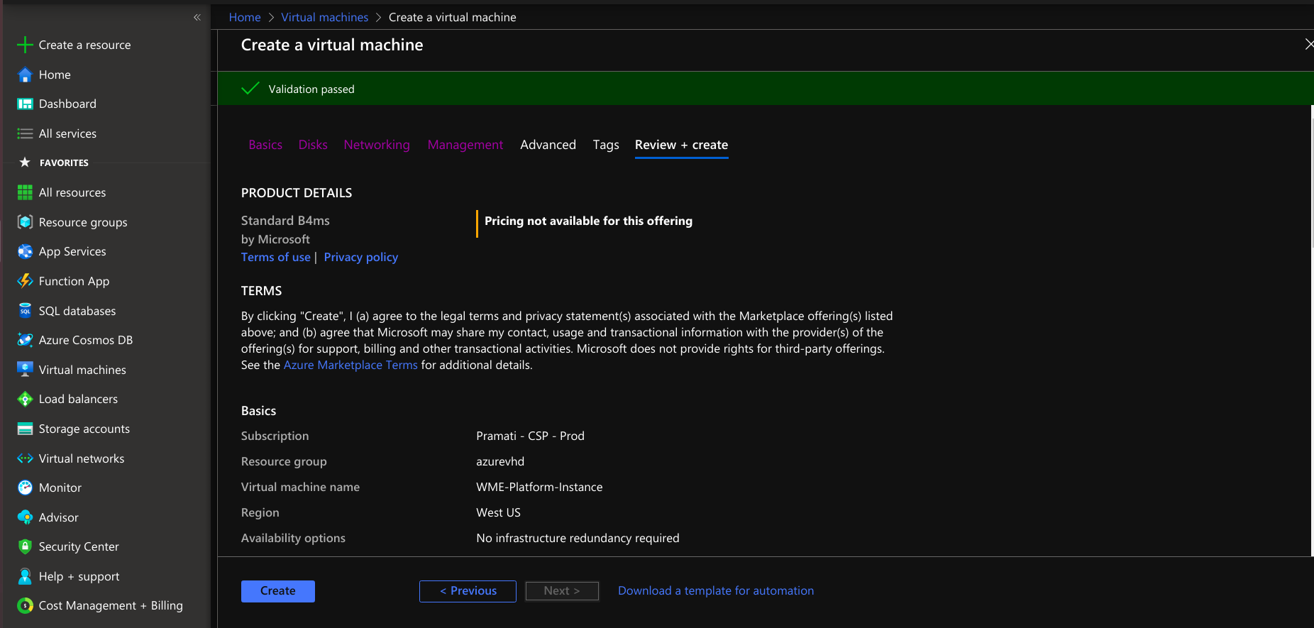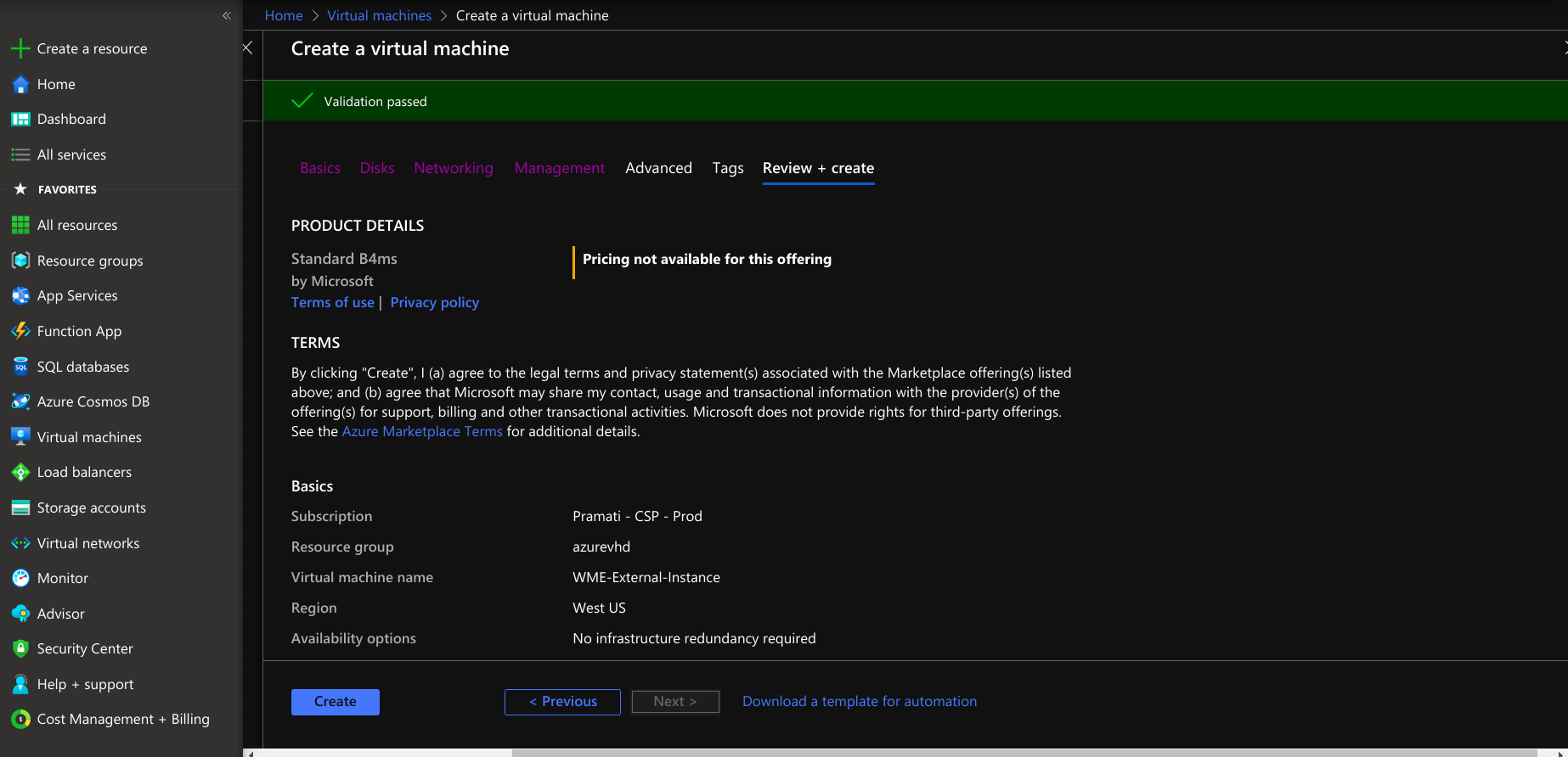 • After reviewing the virtual machine, select the creation option for creating a virtual machine.