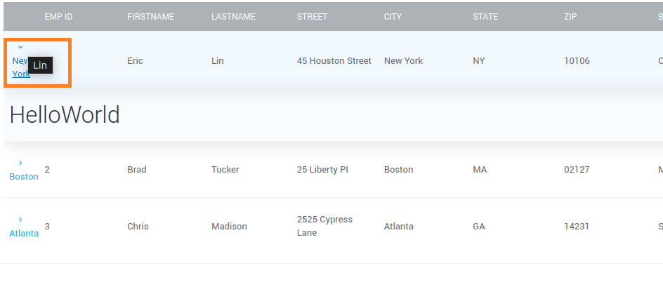 For example, if a user binds the Expand Title to row.firstname and the Collapse Title to row.lastname, the runtime display will reflect these bindings when hovering over the row expansion button, as shown below.