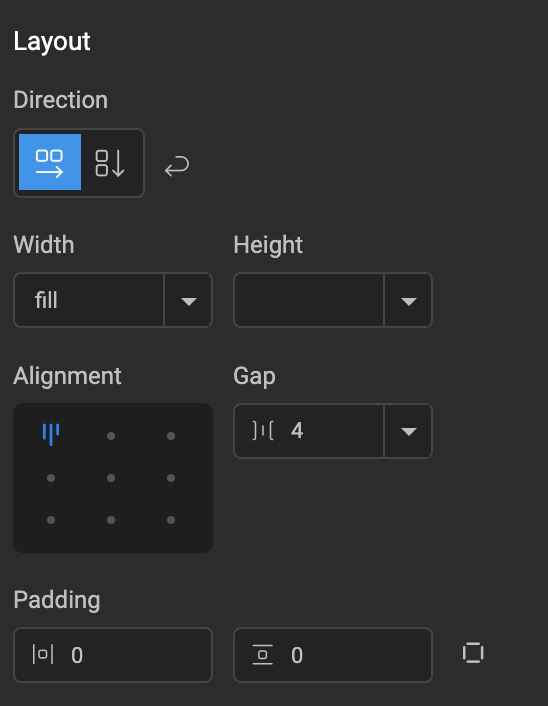 DirectionDefines the primary axis for child elements, horizontal (row) or vertical (column).